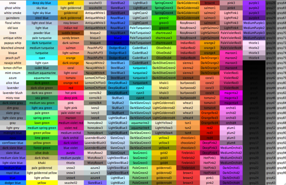 'orange3', 'orange4', 'DarkOrange1', 'DarkOrange2', 'DarkOrange3', 'DarkOrange4',