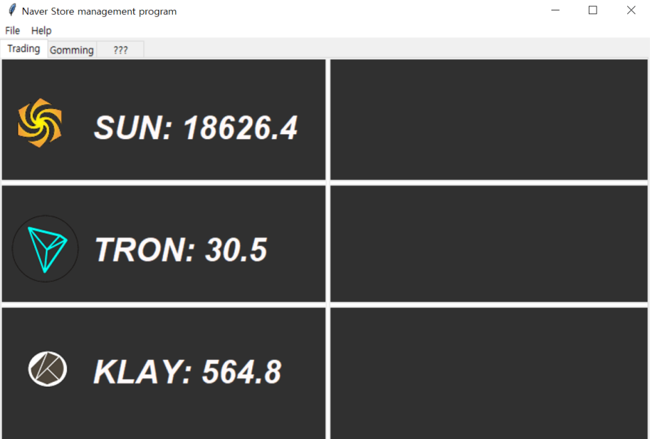lb_KLAY = tkinter.Label(tab1, text='KLAY: %0.1f'%(KLAY), bg='gray19', fg='snow',font=font)