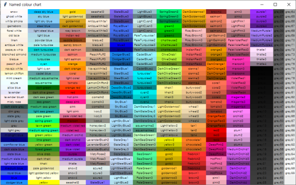 # program taken from http://stackoverflow.com/questions/4969543/colour-chart-for-tkinter-and-tix-using-python # from tkinter import * MAX_ROWS = 36 FONT_SIZE = 10 # (pixels) COLORS = ['snow', 'ghost white', 'white smoke', 'gainsboro', 'floral white', 'old lace', 'linen', 'antique white', 'papaya whip', 'blanched almond', 'bisque', 'peach puff', 'navajo white', 'lemon chiffon', 'mint cream', 'azure', 'alice blue', 'lavender', 'lavender blush', 'misty rose', 'dark slate gray', 'dim gray', 'slate gray', 'light slate gray', 'gray', 'light grey', 'midnight blue', 'navy', 'cornflower blue', 'dark slate blue', 'slate blue', 'medium slate blue', 'light slate blue', 'medium blue', 'royal blue', 'blue', 'dodger blue', 'deep sky blue', 'sky blue', 'light sky blue', 'steel blue', 'light steel blue', 'light blue', 'powder blue', 'pale turquoise', 'dark turquoise', 'medium turquoise', 'turquoise', 'cyan', 'light cyan', 'cadet blue', 'medium aquamarine', 'aquamarine', 'dark green', 'dark olive green', 'dark sea green', 'sea green', 'medium sea green', 'light sea green', 'pale green', 'spring green', 'lawn green', 'medium spring green', 'green yellow', 'lime green', 'yellow green', 'forest green', 'olive drab', 'dark khaki', 'khaki', 'pale goldenrod', 'light goldenrod yellow', 'light yellow', 'yellow', 'gold', 'light goldenrod', 'goldenrod', 'dark goldenrod', 'rosy brown', 'indian red', 'saddle brown', 'sandy brown', 'dark salmon', 'salmon', 'light salmon', 'orange', 'dark orange', 'coral', 'light coral', 'tomato', 'orange red', 'red', 'hot pink', 'deep pink', 'pink', 'light pink', 'pale violet red', 'maroon', 'medium violet red', 'violet red', 'medium orchid', 'dark orchid', 'dark violet', 'blue violet', 'purple', 'medium purple', 'thistle', 'snow2', 'snow3', 'snow4', 'seashell2', 'seashell3', 'seashell4', 'AntiqueWhite1', 'AntiqueWhite2', 'AntiqueWhite3', 'AntiqueWhite4', 'bisque2', 'bisque3', 'bisque4', 'PeachPuff2', 'PeachPuff3', 'PeachPuff4', 'NavajoWhite2', 'NavajoWhite3', 'NavajoWhite4', 'LemonChiffon2', 'LemonChiffon3', 'LemonChiffon4', 'cornsilk2', 'cornsilk3', 'cornsilk4', 'ivory2', 'ivory3', 'ivory4', 'honeydew2', 'honeydew3', 'honeydew4', 'LavenderBlush2', 'LavenderBlush3', 'LavenderBlush4', 'MistyRose2', 'MistyRose3', 'MistyRose4', 'azure2', 'azure3', 'azure4', 'SlateBlue1', 'SlateBlue2', 'SlateBlue3', 'SlateBlue4', 'RoyalBlue1', 'RoyalBlue2', 'RoyalBlue3', 'RoyalBlue4', 'blue2', 'blue4', 'DodgerBlue2', 'DodgerBlue3', 'DodgerBlue4', 'SteelBlue1', 'SteelBlue2', 'SteelBlue3', 'SteelBlue4', 'DeepSkyBlue2', 'DeepSkyBlue3', 'DeepSkyBlue4', 'SkyBlue1', 'SkyBlue2', 'SkyBlue3', 'SkyBlue4', 'LightSkyBlue1', 'LightSkyBlue2', 'LightSkyBlue3', 'LightSkyBlue4', 'SlateGray1', 'SlateGray2', 'SlateGray3', 'SlateGray4', 'LightSteelBlue1', 'LightSteelBlue2', 'LightSteelBlue3', 'LightSteelBlue4', 'LightBlue1', 'LightBlue2', 'LightBlue3', 'LightBlue4', 'LightCyan2', 'LightCyan3', 'LightCyan4', 'PaleTurquoise1', 'PaleTurquoise2', 'PaleTurquoise3', 'PaleTurquoise4', 'CadetBlue1', 'CadetBlue2', 'CadetBlue3', 'CadetBlue4', 'turquoise1', 'turquoise2', 'turquoise3', 'turquoise4', 'cyan2', 'cyan3', 'cyan4', 'DarkSlateGray1', 'DarkSlateGray2', 'DarkSlateGray3', 'DarkSlateGray4', 'aquamarine2', 'aquamarine4', 'DarkSeaGreen1', 'DarkSeaGreen2', 'DarkSeaGreen3', 'DarkSeaGreen4', 'SeaGreen1', 'SeaGreen2', 'SeaGreen3', 'PaleGreen1', 'PaleGreen2', 'PaleGreen3', 'PaleGreen4', 'SpringGreen2', 'SpringGreen3', 'SpringGreen4', 'green2', 'green3', 'green4', 'chartreuse2', 'chartreuse3', 'chartreuse4', 'OliveDrab1', 'OliveDrab2', 'OliveDrab4', 'DarkOliveGreen1', 'DarkOliveGreen2', 'DarkOliveGreen3', 'DarkOliveGreen4', 'khaki1', 'khaki2', 'khaki3', 'khaki4', 'LightGoldenrod1', 'LightGoldenrod2', 'LightGoldenrod3', 'LightGoldenrod4', 'LightYellow2', 'LightYellow3', 'LightYellow4', 'yellow2', 'yellow3', 'yellow4', 'gold2', 'gold3', 'gold4', 'goldenrod1', 'goldenrod2', 'goldenrod3', 'goldenrod4', 'DarkGoldenrod1', 'DarkGoldenrod2', 'DarkGoldenrod3', 'DarkGoldenrod4', 'RosyBrown1', 'RosyBrown2', 'RosyBrown3', 'RosyBrown4', 'IndianRed1', 'IndianRed2', 'IndianRed3', 'IndianRed4', 'sienna1', 'sienna2', 'sienna3', 'sienna4', 'burlywood1', 'burlywood2', 'burlywood3', 'burlywood4', 'wheat1', 'wheat2', 'wheat3', 'wheat4', 'tan1', 'tan2', 'tan4', 'chocolate1', 'chocolate2', 'chocolate3', 'firebrick1', 'firebrick2', 'firebrick3', 'firebrick4', 'brown1', 'brown2', 'brown3', 'brown4', 'salmon1', 'salmon2', 'salmon3', 'salmon4', 'LightSalmon2', 'LightSalmon3', 'LightSalmon4', 'orange2', 'orange3', 'orange4', 'DarkOrange1', 'DarkOrange2', 'DarkOrange3', 'DarkOrange4', 'coral1', 'coral2', 'coral3', 'coral4', 'tomato2', 'tomato3', 'tomato4', 'OrangeRed2', 'OrangeRed3', 'OrangeRed4', 'red2', 'red3', 'red4', 'DeepPink2', 'DeepPink3', 'DeepPink4', 'HotPink1', 'HotPink2', 'HotPink3', 'HotPink4', 'pink1', 'pink2', 'pink3', 'pink4', 'LightPink1', 'LightPink2', 'LightPink3', 'LightPink4', 'PaleVioletRed1', 'PaleVioletRed2', 'PaleVioletRed3', 'PaleVioletRed4', 'maroon1', 'maroon2', 'maroon3', 'maroon4', 'VioletRed1', 'VioletRed2', 'VioletRed3', 'VioletRed4', 'magenta2', 'magenta3', 'magenta4', 'orchid1', 'orchid2', 'orchid3', 'orchid4', 'plum1', 'plum2', 'plum3', 'plum4', 'MediumOrchid1', 'MediumOrchid2', 'MediumOrchid3', 'MediumOrchid4', 'DarkOrchid1', 'DarkOrchid2', 'DarkOrchid3', 'DarkOrchid4', 'purple1', 'purple2', 'purple3', 'purple4', 'MediumPurple1', 'MediumPurple2', 'MediumPurple3', 'MediumPurple4', 'thistle1', 'thistle2', 'thistle3', 'thistle4', 'gray1', 'gray2', 'gray3', 'gray4', 'gray5', 'gray6', 'gray7', 'gray8', 'gray9', 'gray10', 'gray11', 'gray12', 'gray13', 'gray14', 'gray15', 'gray16', 'gray17', 'gray18', 'gray19', 'gray20', 'gray21', 'gray22', 'gray23', 'gray24', 'gray25', 'gray26', 'gray27', 'gray28', 'gray29', 'gray30', 'gray31', 'gray32', 'gray33', 'gray34', 'gray35', 'gray36', 'gray37', 'gray38', 'gray39', 'gray40', 'gray42', 'gray43', 'gray44', 'gray45', 'gray46', 'gray47', 'gray48', 'gray49', 'gray50', 'gray51', 'gray52', 'gray53', 'gr